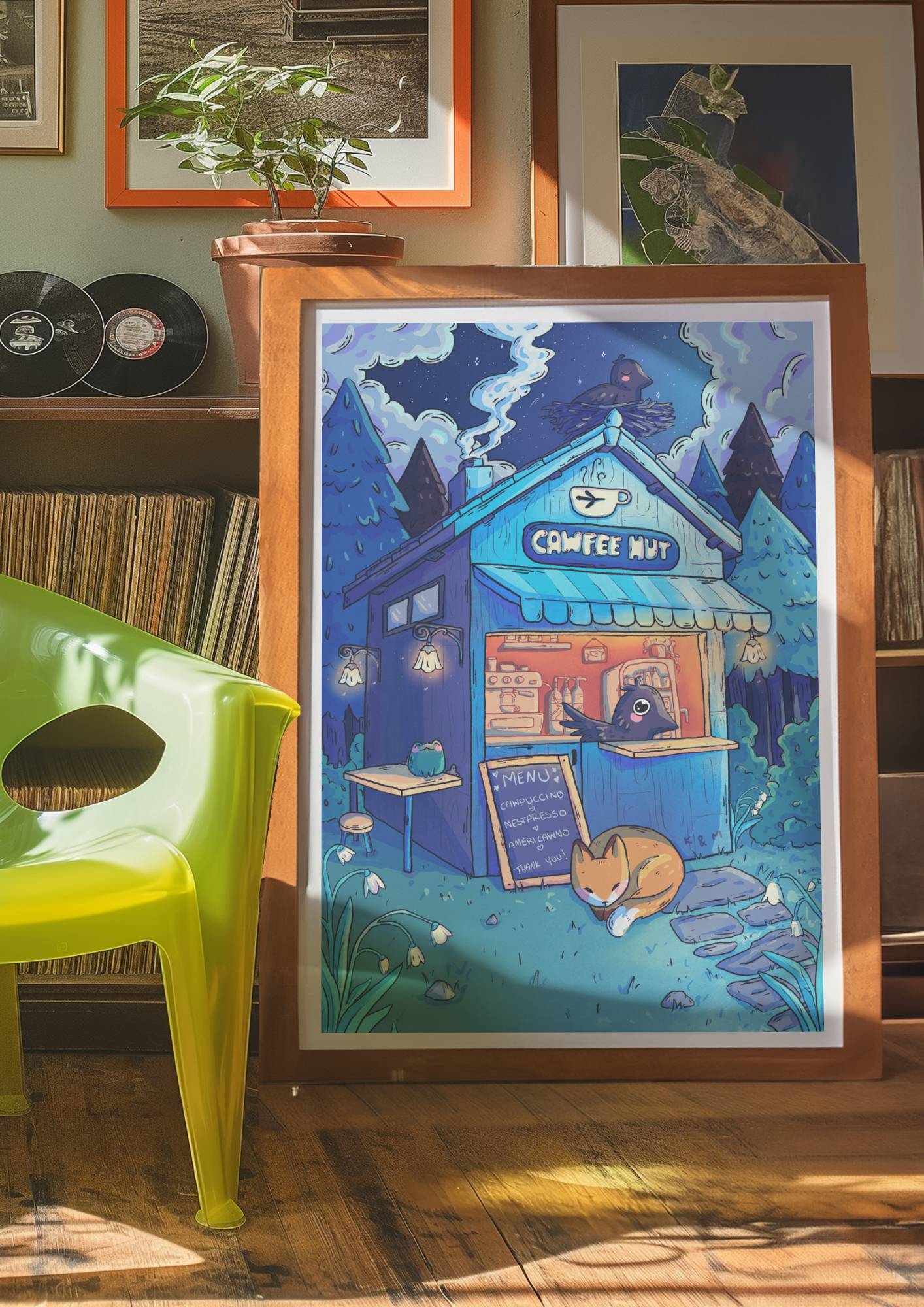 Welcome to the whimsical world of the Cawfee Hut – a charming art print featuring a cosy little coffee hut nestled in the woods, lovingly run by a clever little crow. This delightful print captures the warmth and humour of woodland life, complete with a playful drinks menu offering favourites like Cawpuccino, Nestpresso, and Americawno.