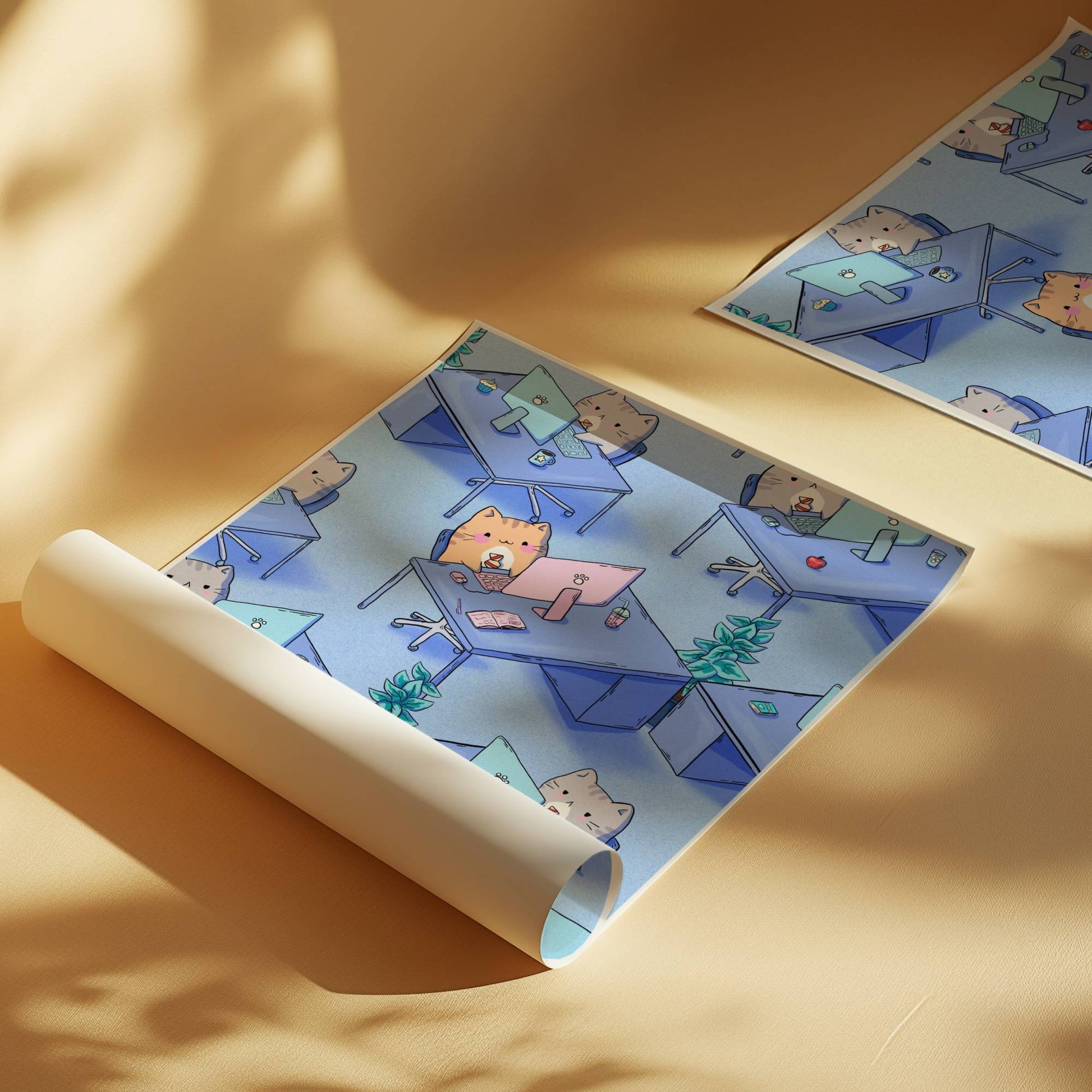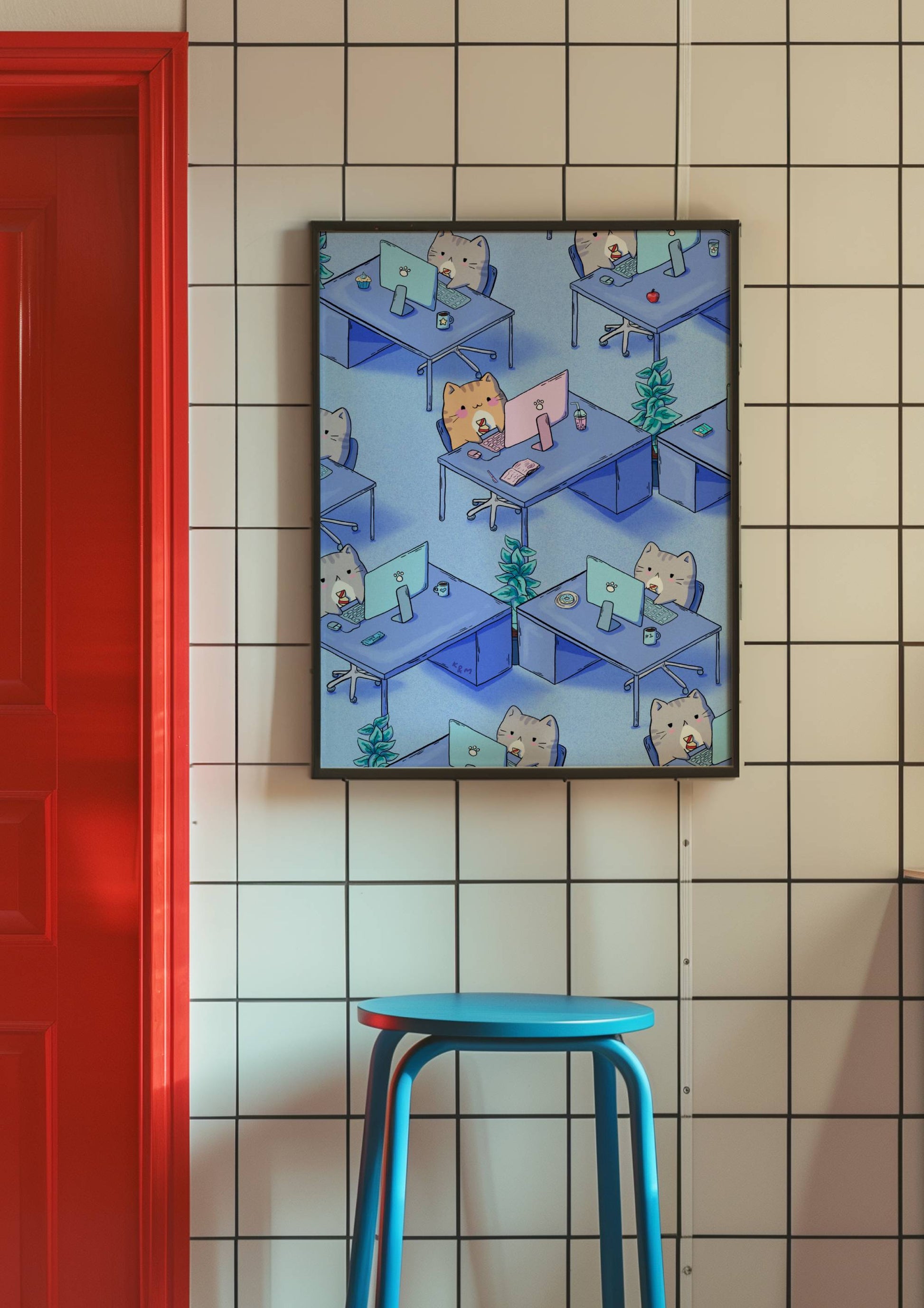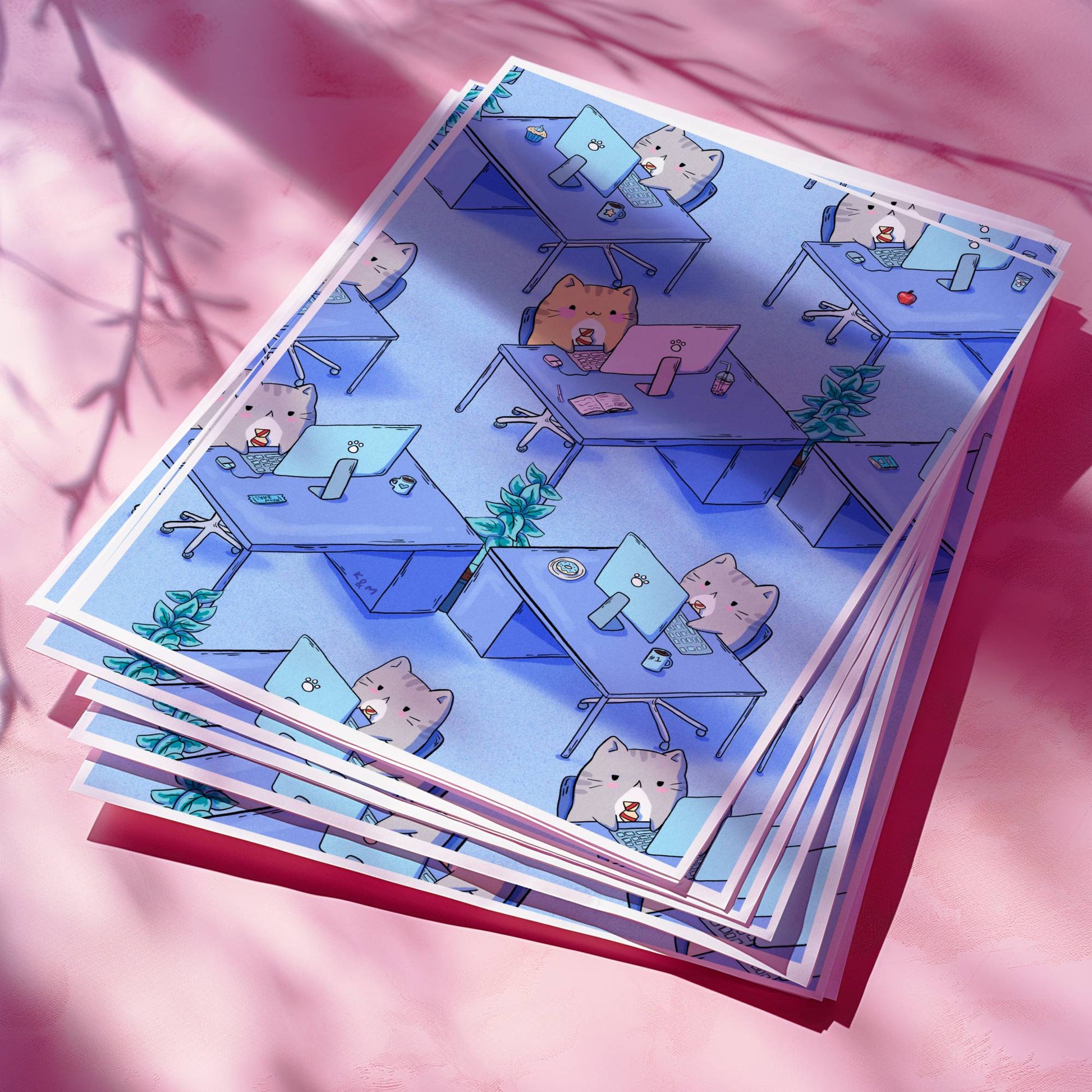 Say hello to Corpo Kitty Inc., a purr-fectly adorable art print featuring a busy office of grey tabby corporate cats—each hard at work at their desks. But one cheeky ginger tabby with rosy cheeks and a pink desk isn’t afraid to stand out from the crowd. 💖