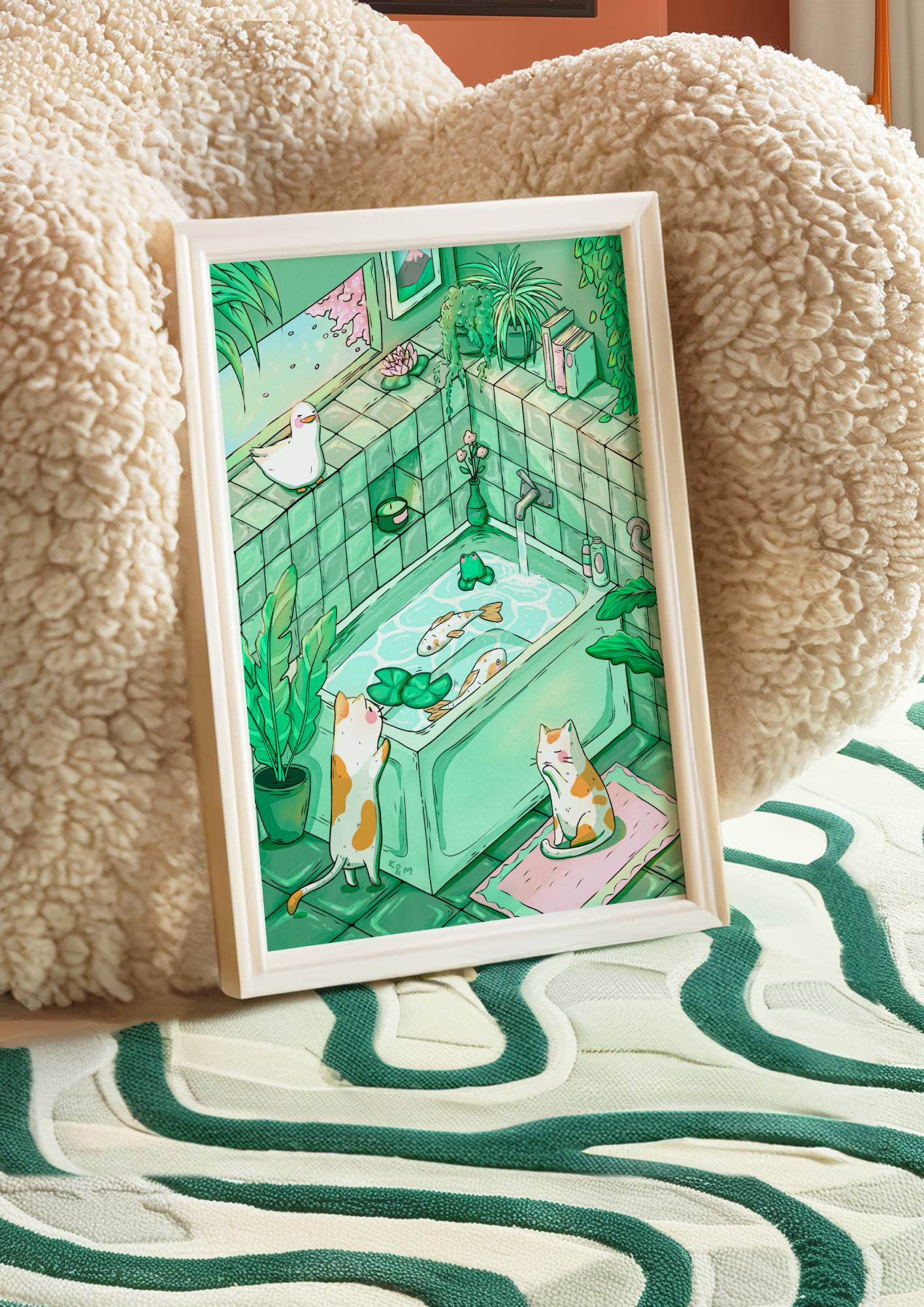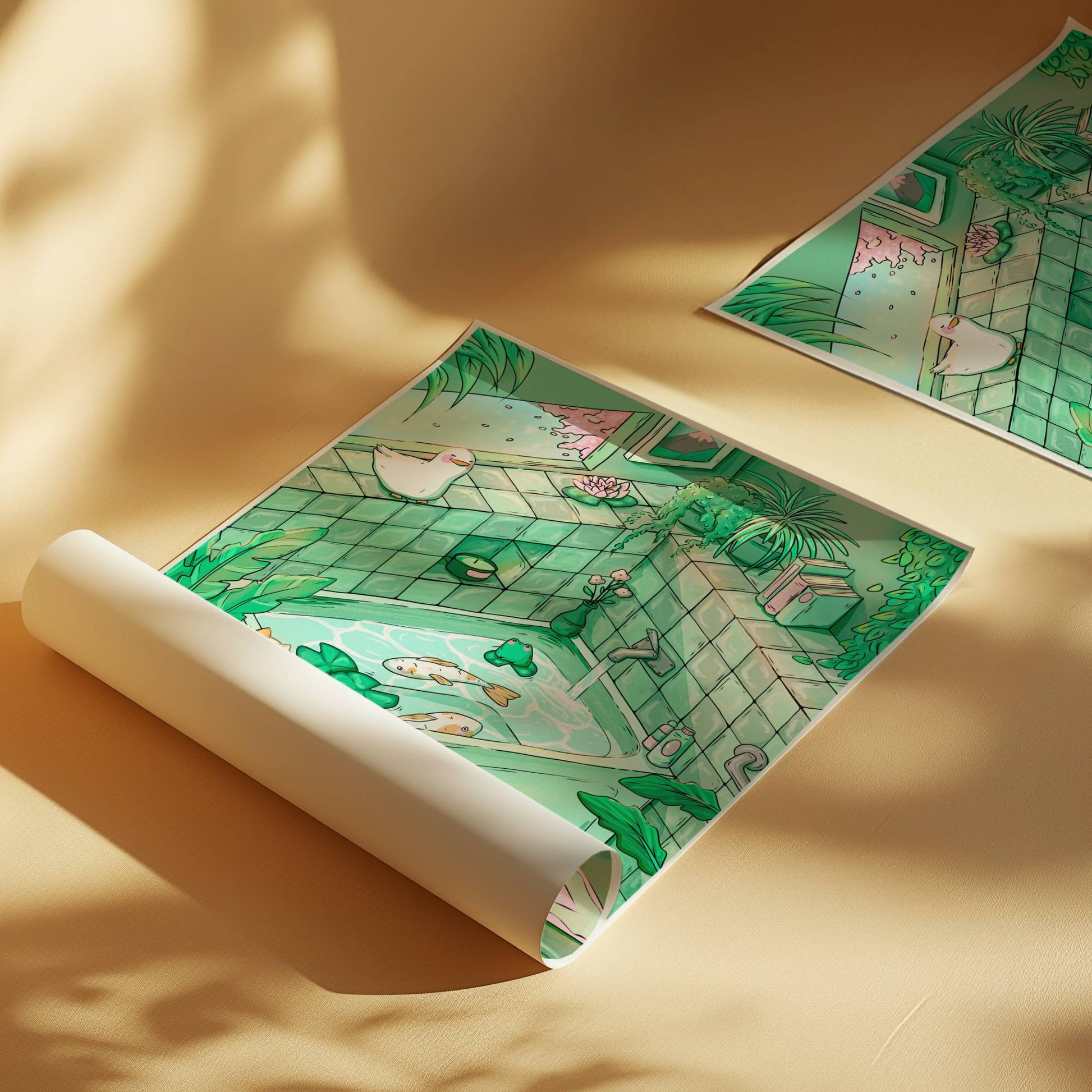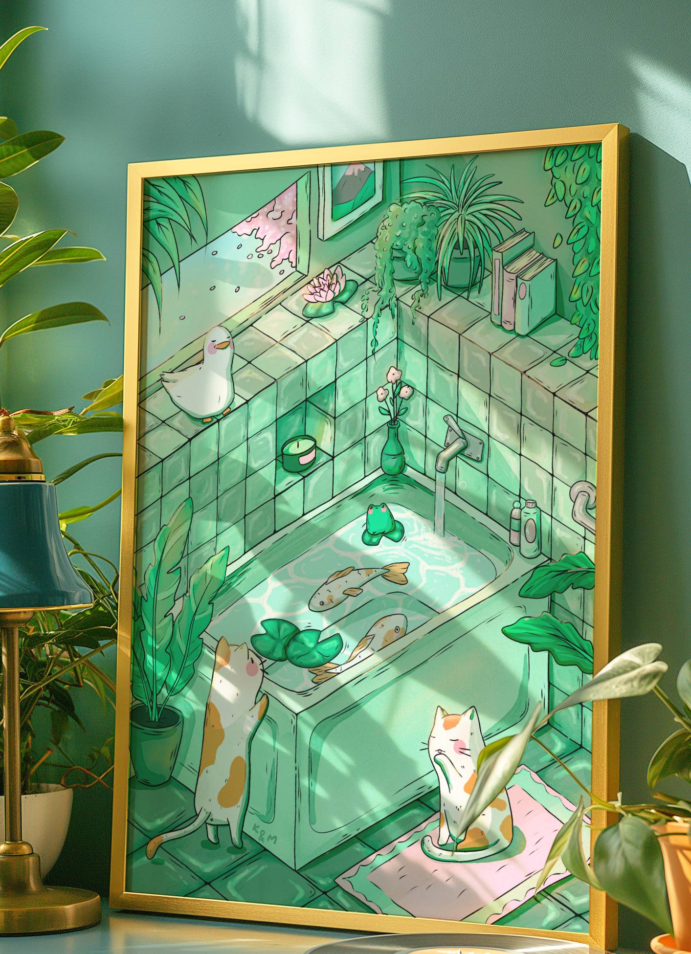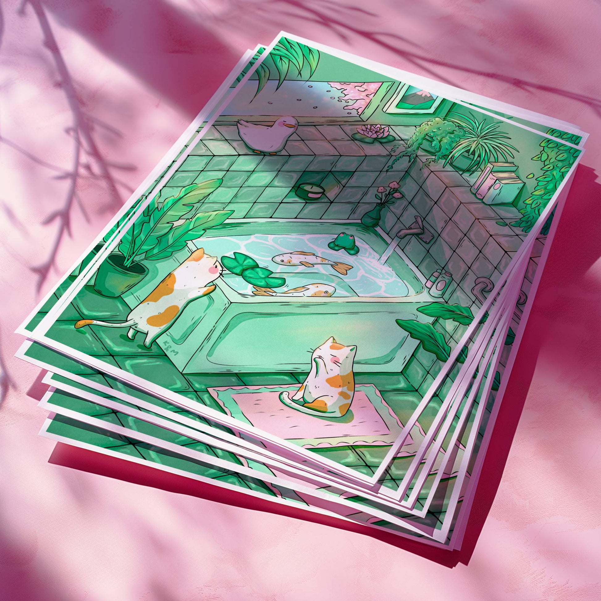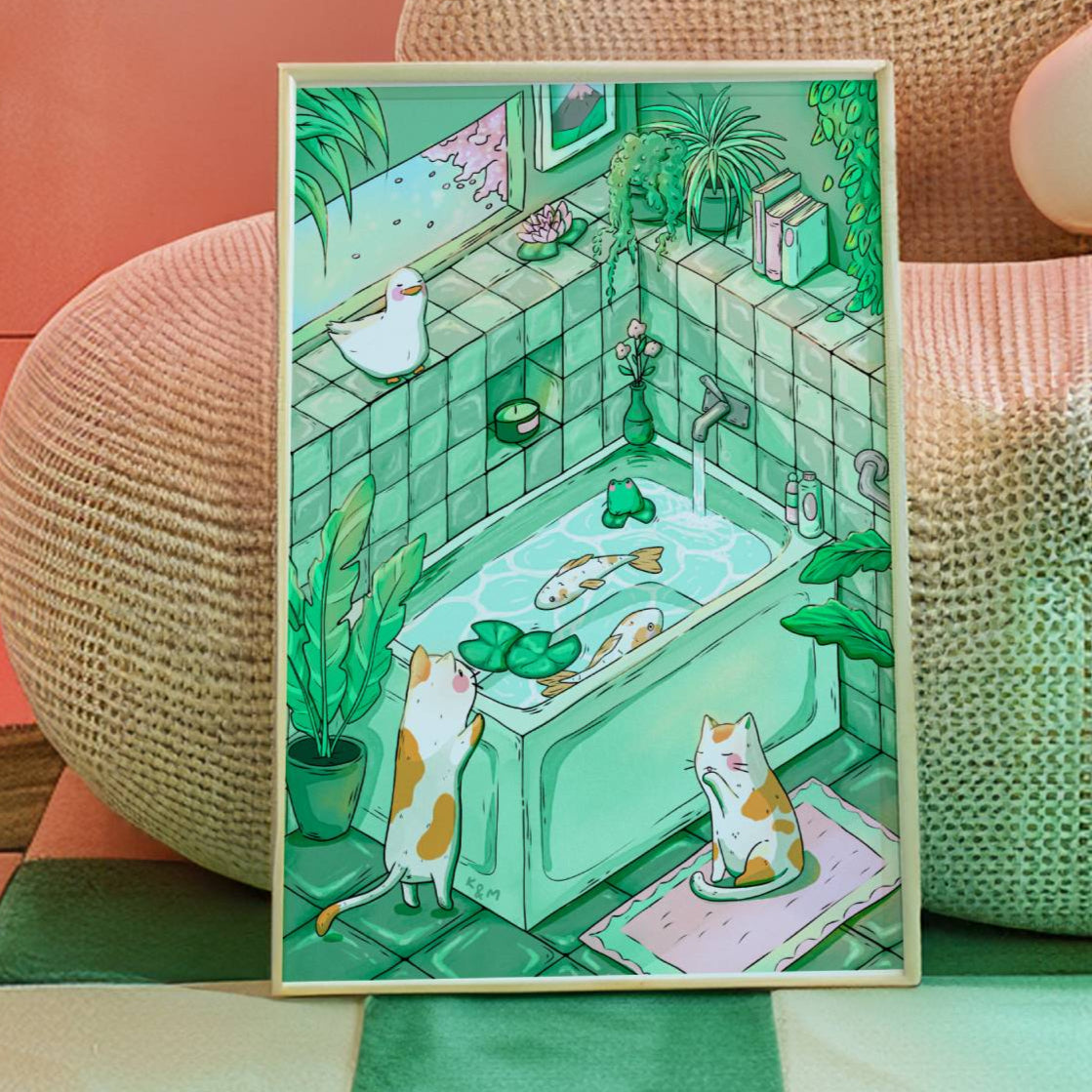 Add a splash of charm and curiosity to your space with "Don't Be So Koi!" โ a delightful original art print full of playful detail and cosy vibes. Set in a serene green aesthetic bathroom, this illustration features two koi fish soaking in a bathtub, while two curious calico cats peek over the edge. Look closer and youโll spot a sneaky frog and duck making a surprise cameo! ๐โจ