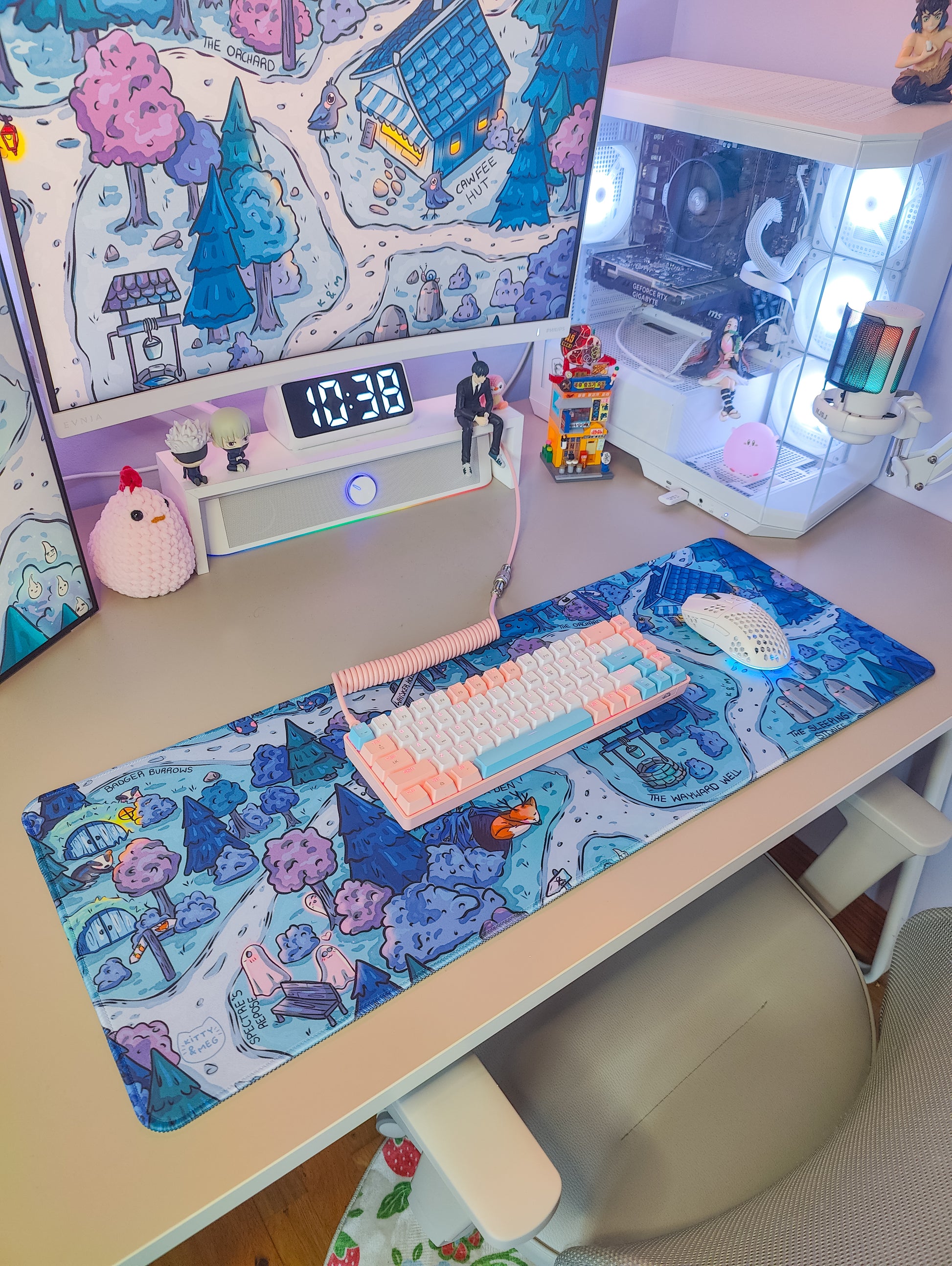 Bring a touch of whimsical charm to your workspace with the Evenfall Grove Desk Mat, a beautifully illustrated fantasy map designed in Ireland. Featuring adorable hand-drawn locations like the Wayward Well, Cawfee Hut (run by two friendly crows), Spriteberry Bushes, and Badger Burrows, this desk mat transforms any desk into a cosy, imaginative landscape.