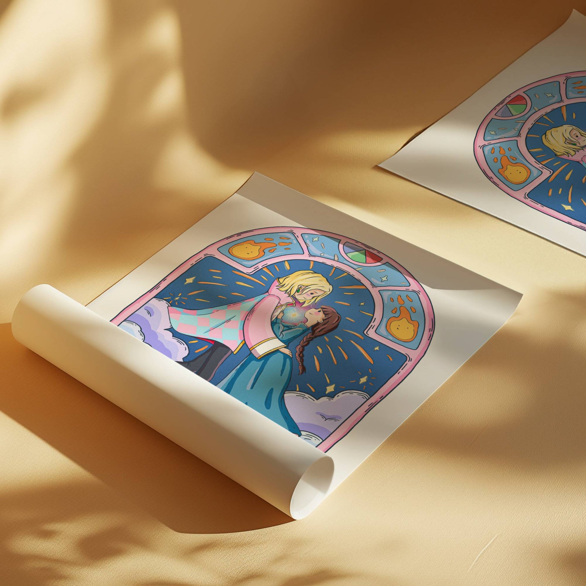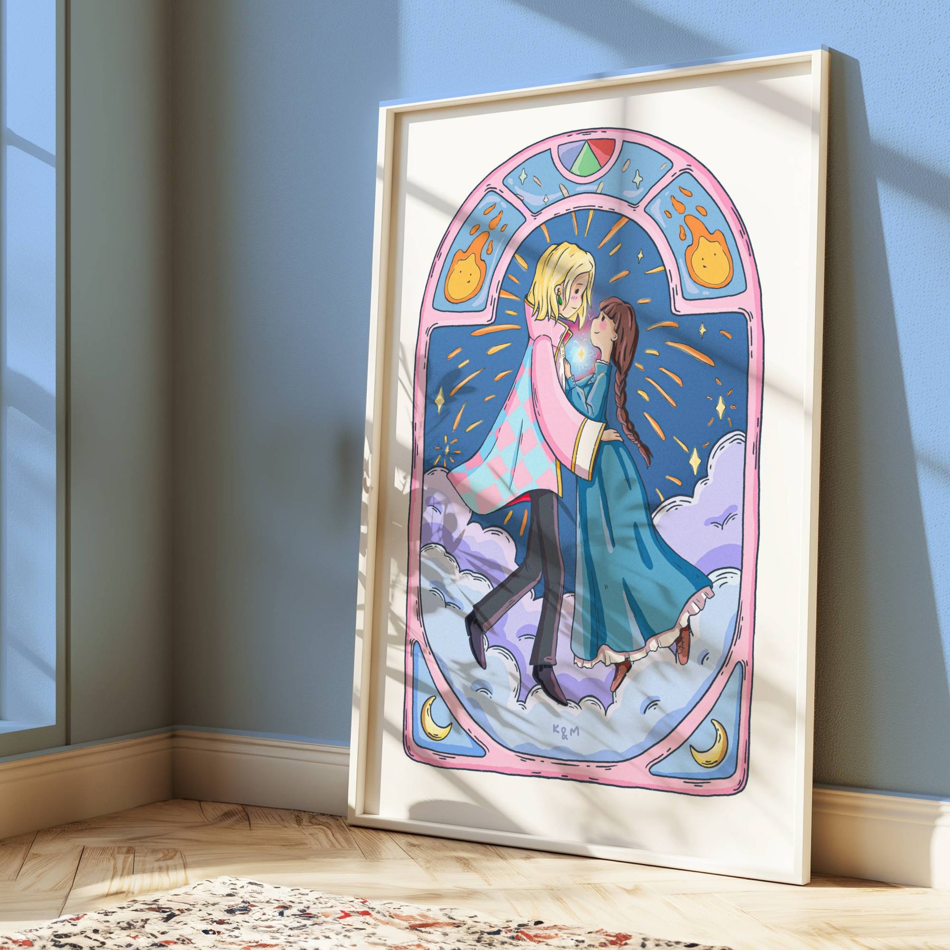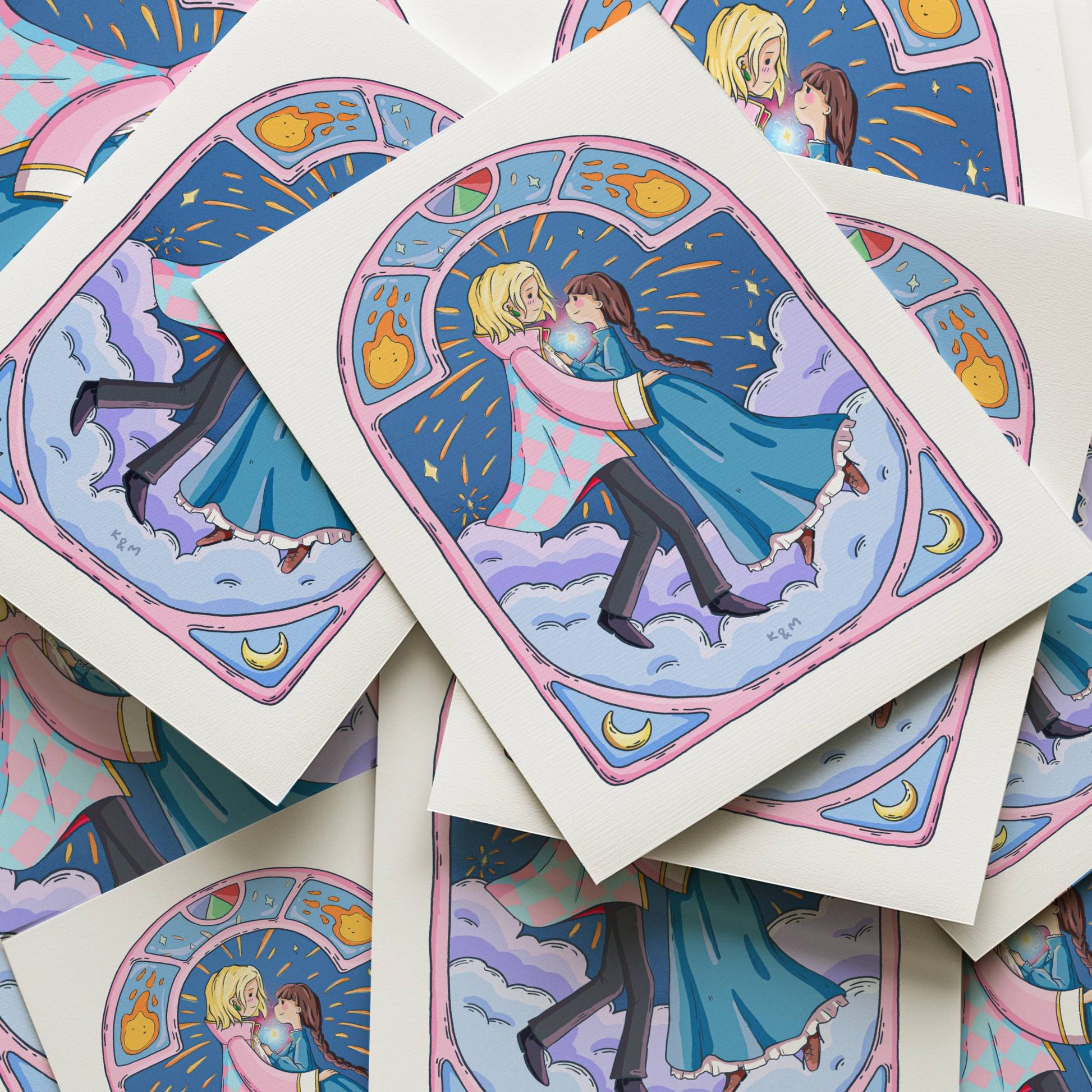 Bring the magic of anime to your walls with "Howl and Sophie" – a dreamy, original art print inspired by the beloved characters from Howl’s Moving Castle. This enchanting scene features Howl and Sophie floating hand-in-hand through soft clouds, with shooting stars streaking the sky behind them ✨