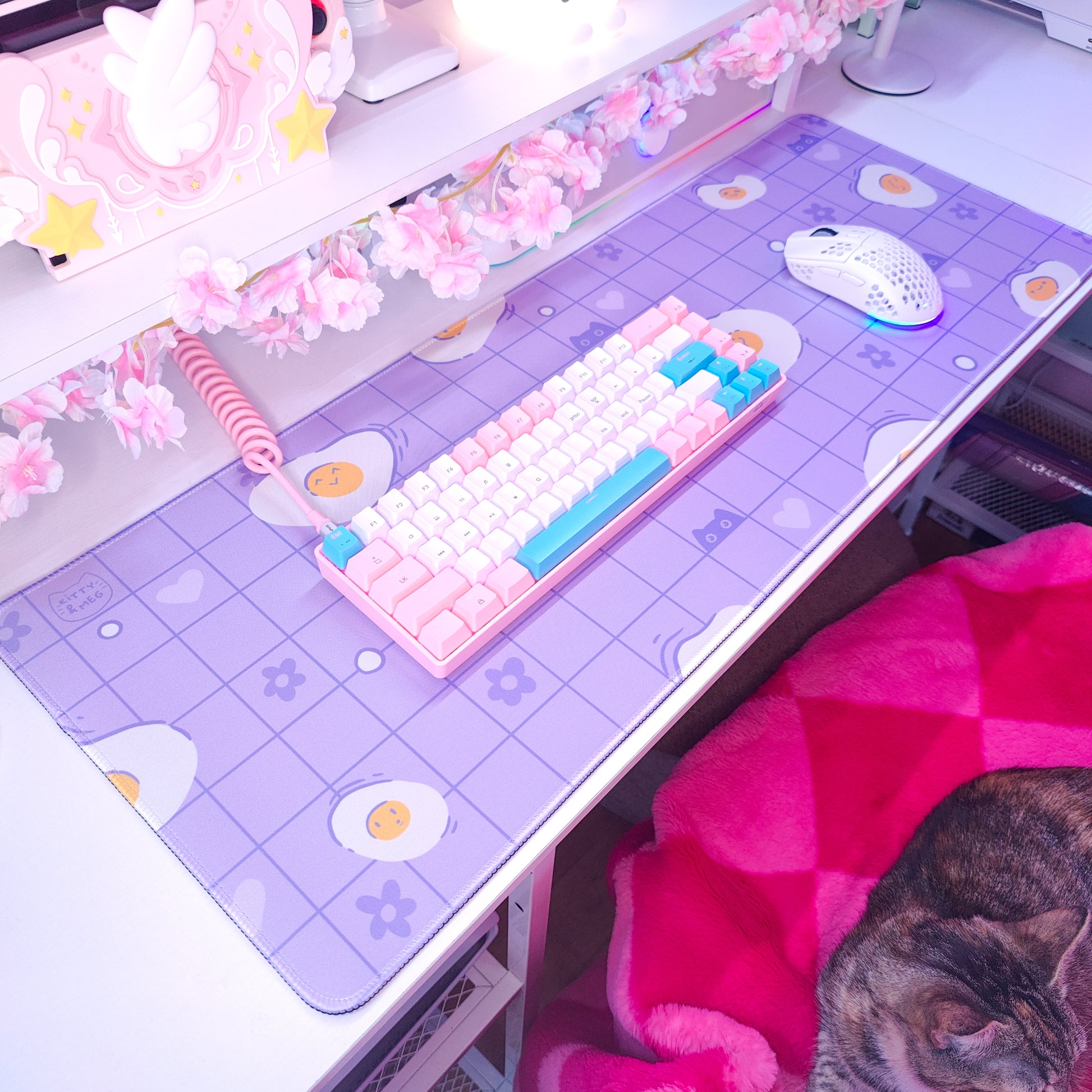 Brighten up your setup with a dash of fun and a sprinkle of quirkiness! The Sunny Side Up Gaming Desk Mat features an original kawaii design of cheerful fried eggs scattered across a purple grid, playfully mixed with tiny cats and cute flowers. It's a joyful mix of breakfast vibes and adorable chaos—perfect for anyone who loves a unique, character-filled workspace.